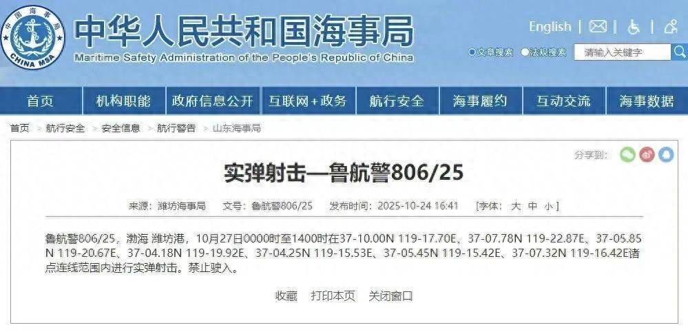 据中国海事局网站音问,潍坊海事局发布飞行造就,10月27日0时至14时,渤海潍坊港部分海域进行实弹射击,辞谢驶入。