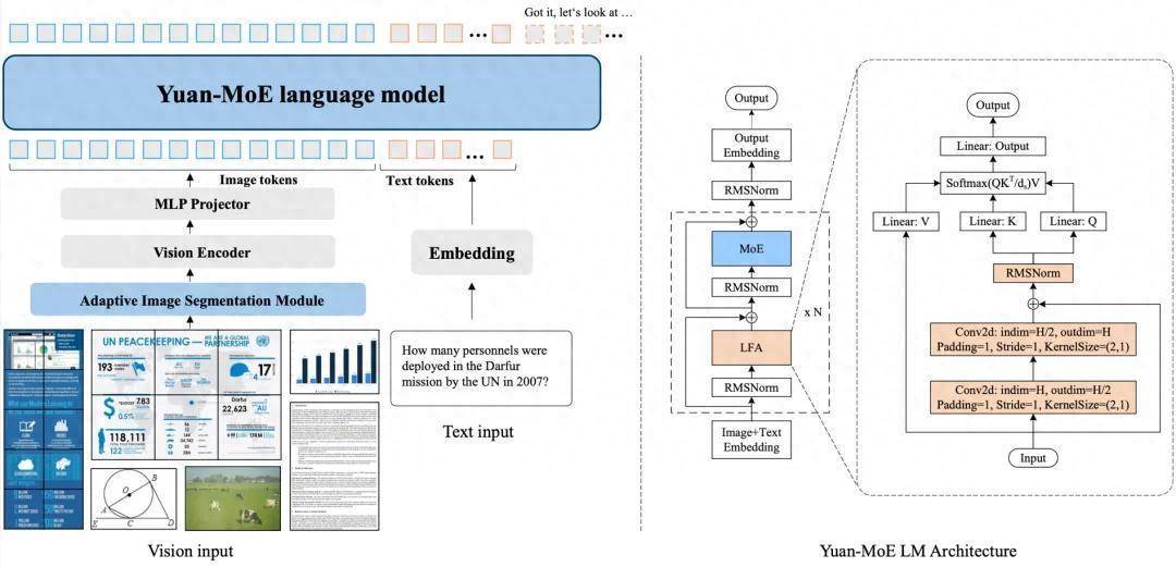 图1左侧为Yuan 3.0架构,含三个组件:(1) ViT编码器处理图像;(2) 轻量级MLP投影器对王人视觉与文本特征;(3) 基于MoE的话语模子。右侧为秉承局部过滤进展力(LFA) 的源3.0话语骨干网罗。