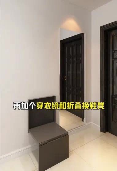 对面墙面装一面1m宽的全身镜(离大地10cm,幸免积灰),再配一个折叠换鞋凳,外出前照镜子整理穿搭,换鞋时掀开凳子,用完收起来不占地,生动又实用。